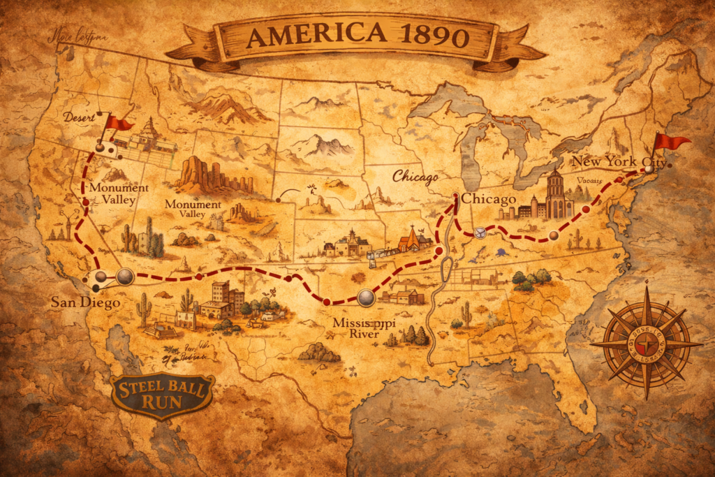 Steel Ball Run is part seven of the legendary JoJo’s Bizarre Adventure series, originally created by Hirohiko Araki. Unlike the earlier seasons that follow a continuous timeline, this part is set in an alternate universe — taking place in the United States in 1890.