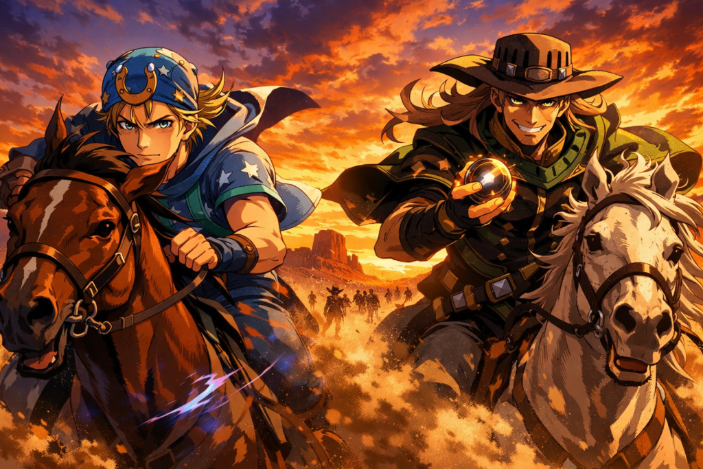 Get ready to ride with Johnny and Gyro — Steel Ball Run is on its way! 🐎✨