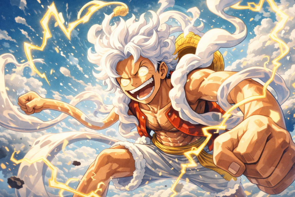 Gear 5 isn’t just a power-up—it’s a concept. Luffy’s awakening of the Hito Hito no Mi, Model: Nika turns him into a cartoonish force of chaos.