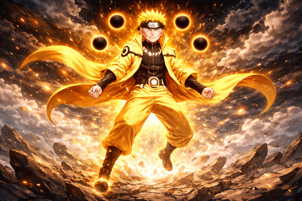 Naruto on his prime (specially in war arc) Sure, he gets god-tier powers from Hagoromo Otsutsuki. His offensive moves can turn terrain to ash, and his speed is up there with light-based techniques.