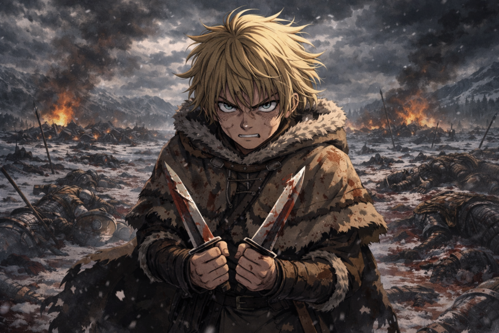 After his father’s death, Thorfinn follows Askeladd’s mercenary group. Still a child, he learns how to fight, kill, and survive on brutal battlefields. His first kill marks the loss of innocence—he is no longer just a boy, but not yet a man either.