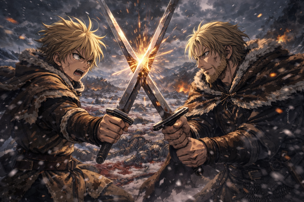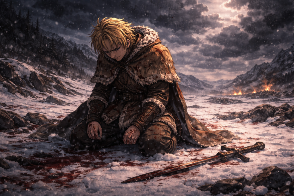 In the final episode, Thorfinn collapses in grief and confusion. The promise that defined his existence is gone. His father’s words echo in silence: “You have no enemies.”